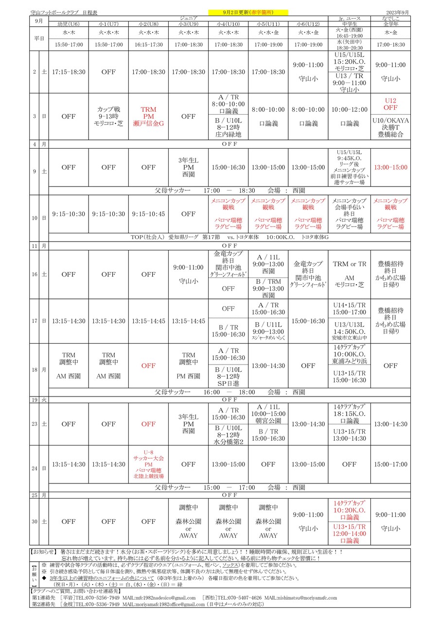 また、試合などの予定追加、変更が一部ございます